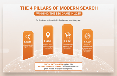 Everyone says “Do SEO,” but search today is no longer just one thing. Businesses must now optimize across *SEO, GEO, PPC, and AEO* to dominate visibility online. While SEO drives organic traffic, GEO ensures top local map results, PPC provides immediate exposure, and AEO (Answer Engine Optimization) ensures AI-powered answers appear at the top. The modern digital marketing expert, like Dhana Sekaran of Digital with Dhana, combines these strategies to deliver full-spectrum online visibility.